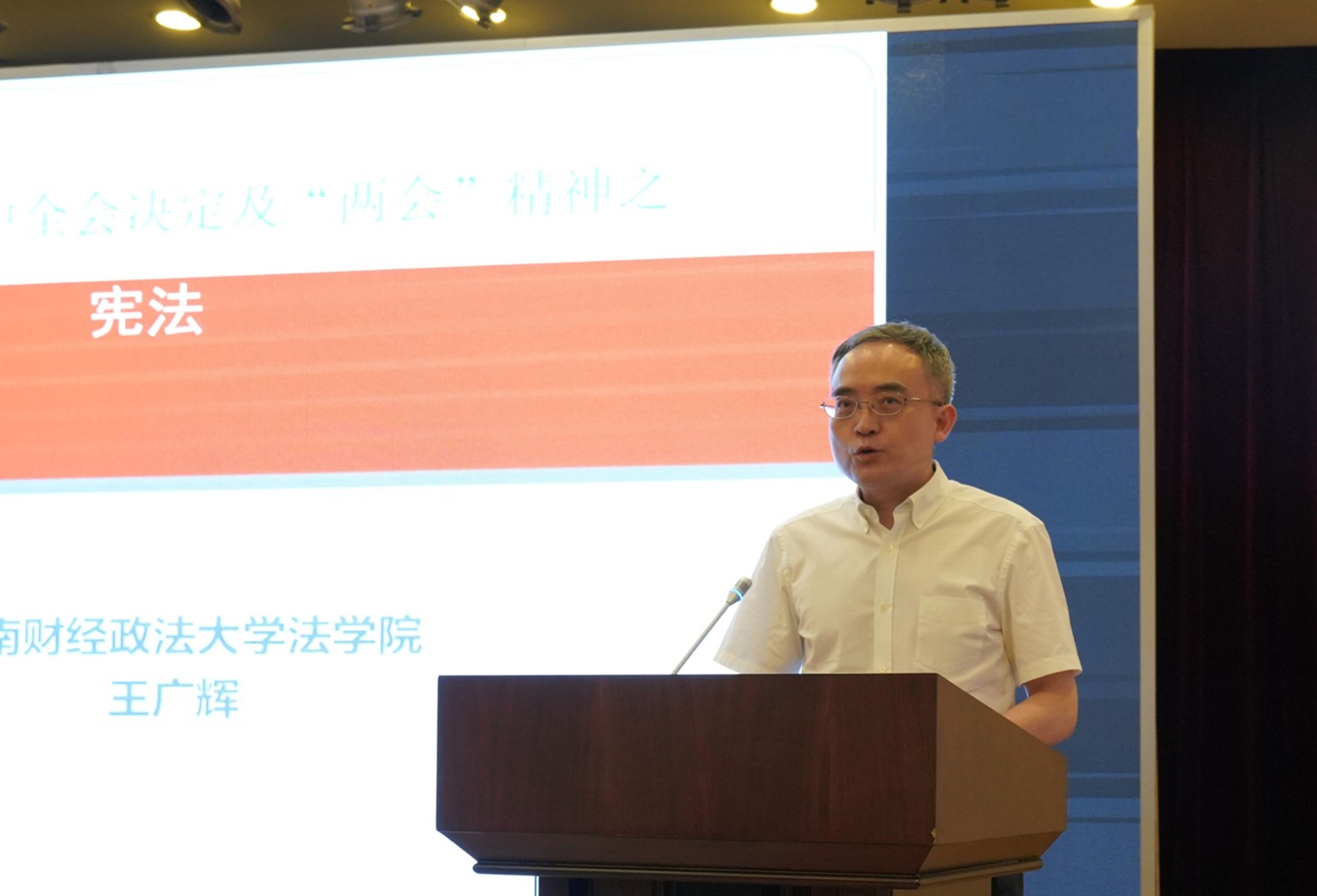 第三、王教授介绍了宪法与民主制度的相互关系,详细介绍了人民代表大会制度、民族区域自治制度、特别行政区制度、政治协商制度、公有制的经济制度以及基层自治制度;