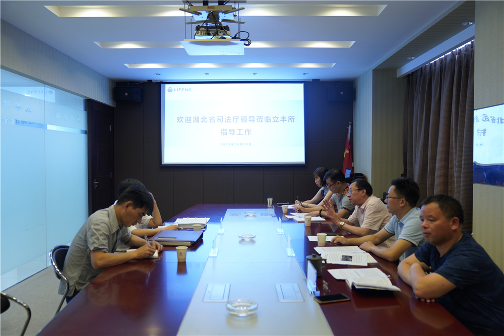 2018年6月8日上午九时三十分,湖北省司法厅政治(警务)部组宣处江峰副处长及湖北省女子强制隔离戒毒所政治处吴斌副主任莅临湖北立丰律师事务所(以下简称“立丰所”)开展省文明单位届中测评会。立丰所首席合伙人及律所主任汪少鹏、副主任占传德及党支部汪后新副书记、监事会监事邵华律师参加了会谈。