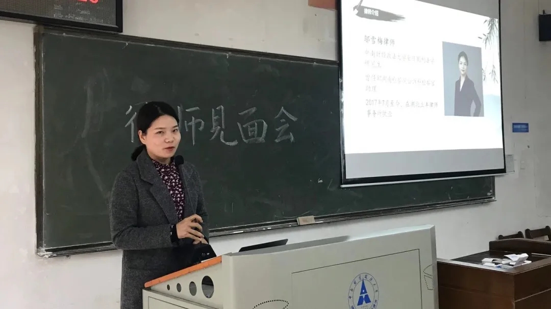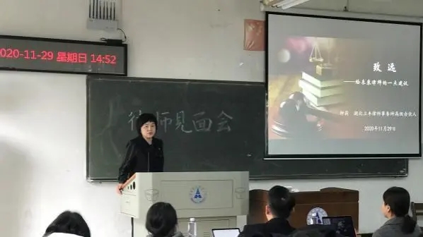 2020年11月29日下午,中南财经政法大学未来律师协会策划、组织即将毕业的学生在中南财经政法大学文澜楼109教室举办了“律师见面会”,湖北立丰律师事务所(以下简称立丰所)高级合伙人(律师)汪群、钟莉,专职律师邬雪梅、刘泽博四人受邀参与。该活动主要是让法学学子们了解律师这个行业,同时几位律师也是想通过这个活动为立志做律师的同学提供一个沟通的渠道,发现、培养未来律师人才。