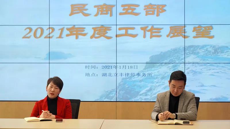 2021年1月18日,湖北立丰律师事务所民商五部开展了2020年度年终工作总结,并对2021年部门工作进行了规划与展望。本次会议由立丰所高级合伙人、民商五部部长邱丹律师与立丰所事业合伙人、民商五部副部长段斌律师组织召开。