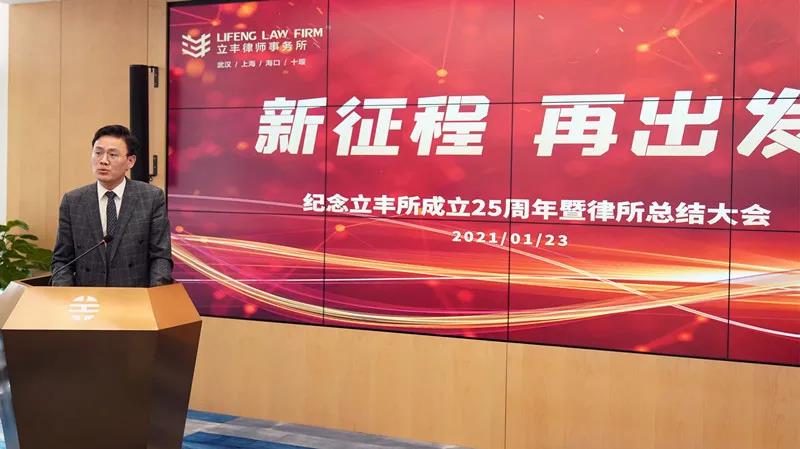 2021年1月23日下午,湖北立丰律师事务所(以下简称“立丰所”)“纪念立丰所成立25周年暨2020年度总结会”在律所18楼1号会议厅隆重召开。受新冠肺炎疫情影响,遵照上级部门的规定与要求,本次会议采取“线上线下”相结合的方式举行,立丰所权益合伙人、事业合伙人、普通合伙人、各类受表彰人员及行政辅助人员参与了现场会议,除上述人员以外的各类律师以及立丰上海分所、海口分所、十堰分所和在外地办理破产项目的团队参与了线上会议。