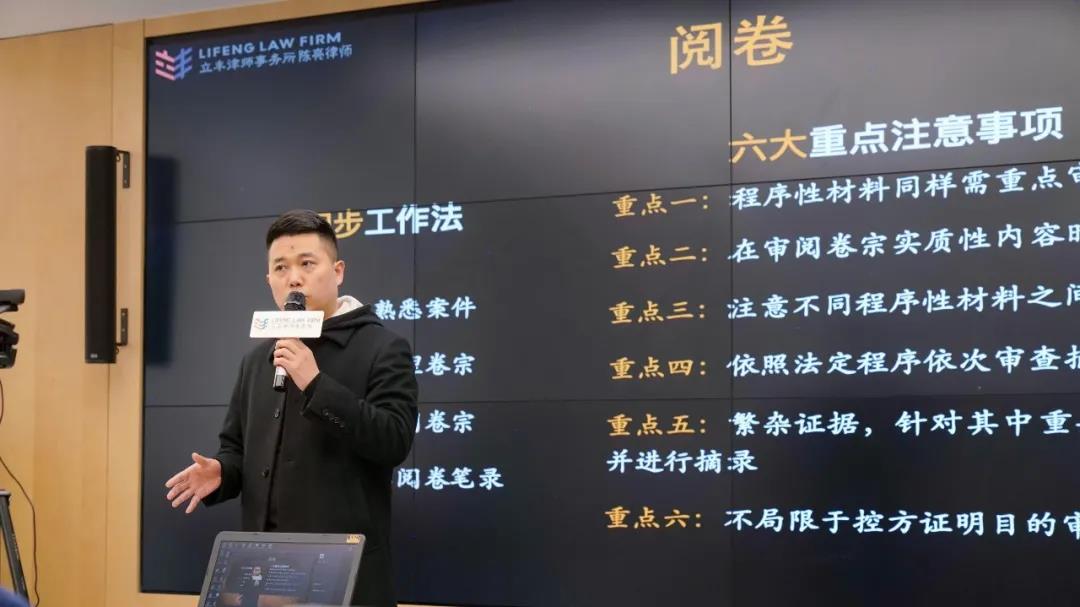 随后,陈亮律师根据刑事案件的不同类型,对如何开展阅卷工作进行了讲解,提出了阅卷的四步工作法,即“熟悉案件、整理卷宗、审阅卷宗、制作阅卷笔录”,以及六大重点注意事项,即“程序性材料同样需重点审查摘录”;“在审阅卷宗实质性内容时,也需注意程序问题”;“注意不同程序性材料之间的审查对比”;“依照法定程序依次审查摘录”;“根据关键词审查摘录证据,繁杂证据,针对其中重要内容,分组比对,并进行摘录”;“不局限于控方证明目的审查、摘录证据”。