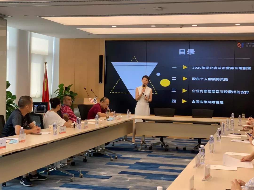 邱丹律师以“企业家的法律课堂”为主题,首先向在场的企业家说明了2020年湖北省法治营商环境的现状,之后又分析了企业家个人在公司经营中可能存在的一些债务风险,然后详细解释了企业内部控制权与经营权的安排,最后给大家普及了合同风险管理的一些知识。