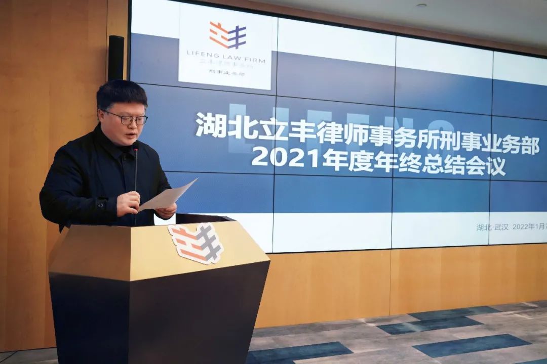 2022年1月7日9:00-12:00,湖北立丰律师事务所(以下简称“立丰所”)刑事业务部2021年总结大会在事务所18楼1号会议厅成功召开。立丰所首席合伙人、律所战略发展咨询委员会主任、刑事业务部顾问汪少鹏,权益合伙人、律所管理工作委员会(以下简称“管委会”)副主任周宏力,权益合伙人、管委会副主任陈亮,权益合伙人、刑事辩护研究中心副主任汪群,海口分所执行主任余德光(受邀参会),及事业合伙人、普通合伙人、兼职律师、专职律师、工薪律师、实习律师、部门秘书等36名律师及相关人员参加了本次会议。