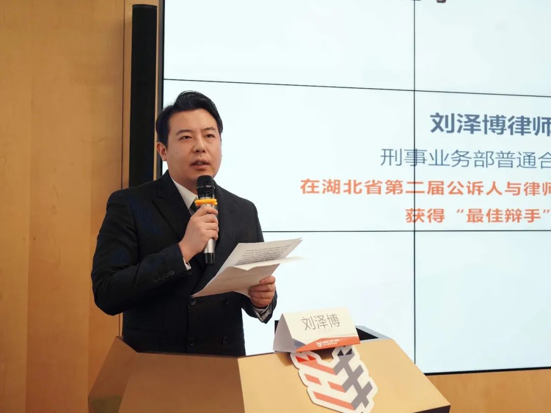 普通合伙人刘泽博律师,曾在湖北省第二届公诉人与律师电视论辩赛获得“最佳辩手”奖。他用两组关键词来展开分享自己的所见、所想、所感。第一组关键词是成长的苦与甜。他以自己主办的两个案件为例,告诫年轻律师不能简单预设案件的轻与重,鼓励大家为了案子做的每一份努力都不会白费,都是我们作为律师的光荣。第二组关键词是个人收获与平台的价值。他分享了自己在公诉人大赛中的学习、集训和比赛经历,告诉我们珍惜平台带给我们的机会,学会在前辈的成就下汲取成功的养分。