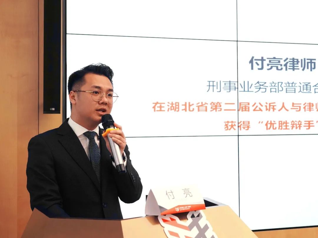 普通合伙人付亮律师,曾在湖北省第二届公诉人与律师电视论辩赛获得“优胜辩手”奖。他结合自己的执业经历和人生感悟同大家分享了主题“做律师教会我的6个道理”。一是把自己的本事练好,其他的自然会来;二是不说硬话,不做软事;三是重视长期积累,量变会引起质变;四是主动学习,保持谦虚;五是能进能退,乐观面对;六是多分主动,心存感激。