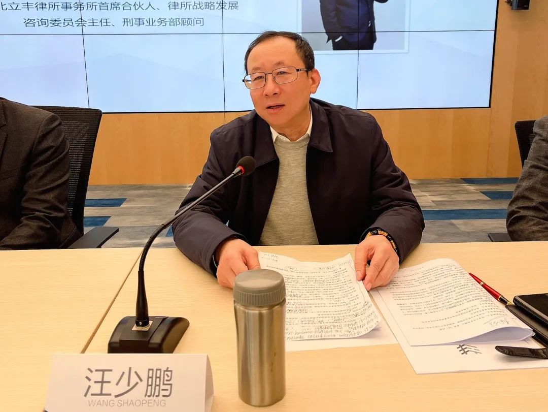 立丰所首席合伙人、律所战略发展咨询委员会主任、刑事业务部顾问汪少鹏致辞。 汪少鹏主任首先对本次会议的结构安排表示了“高度评价、充分肯定”。他指出每个环节都具有代表性,每位同志的发言都很务实、接地气、有水平、质量高,体现了刑辩人的情怀,代表了刑部乃至立丰的正能量和业务水平。