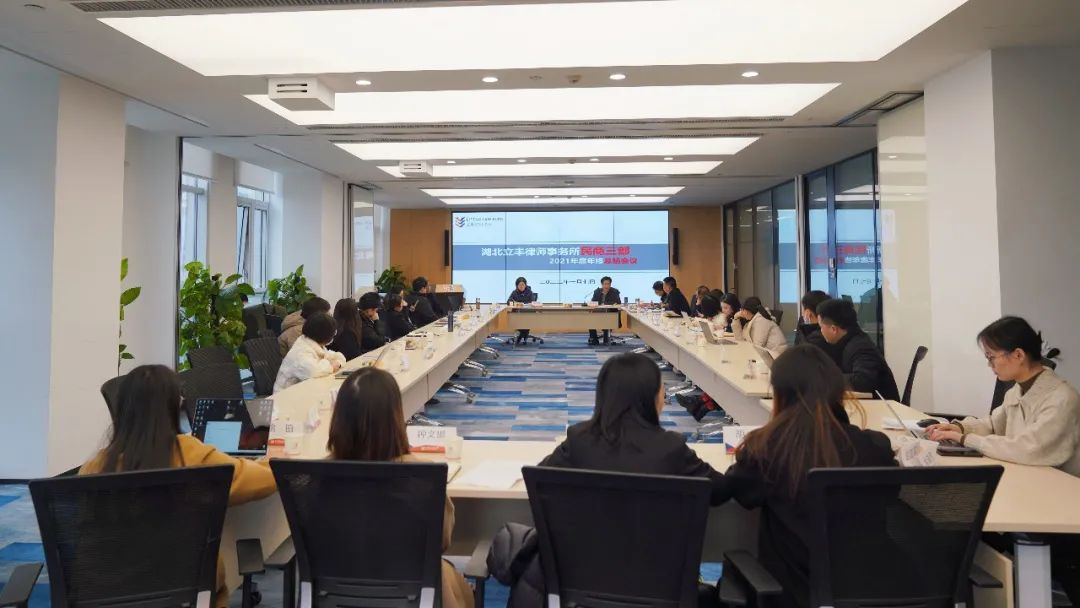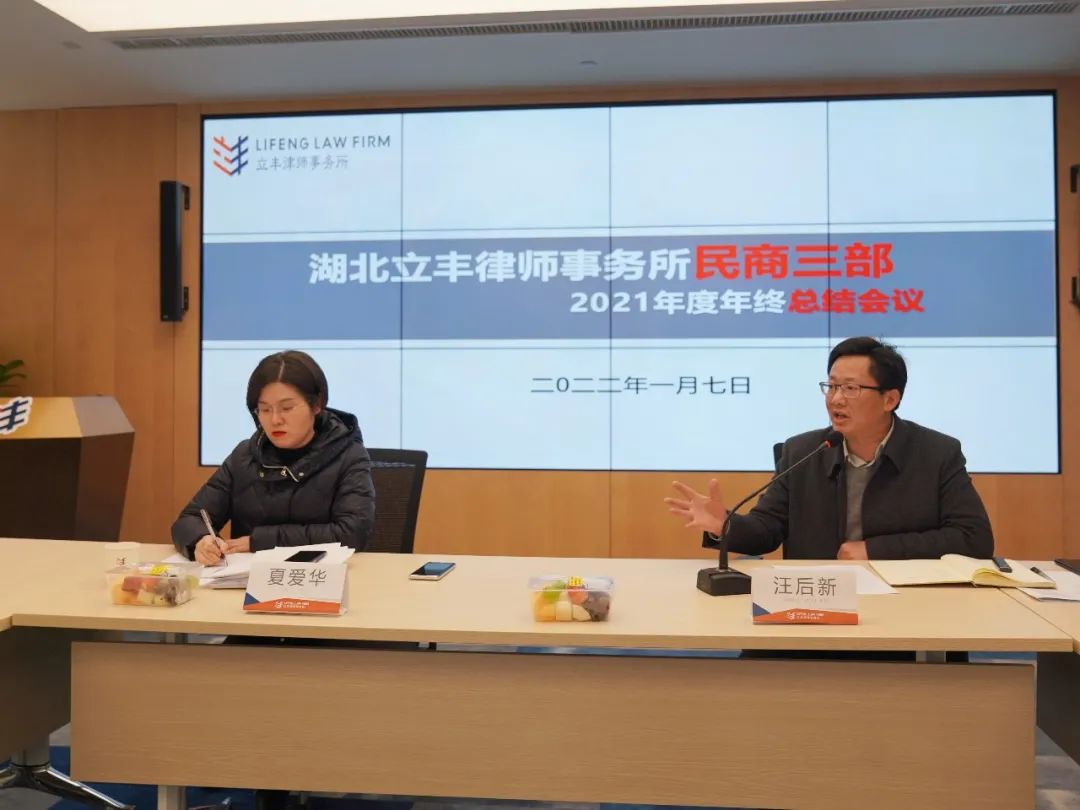 2022年1月7日下午,湖北立丰律师事务(以下简称“立丰所”)民商事法律业务三部(以下简称“民三部”)成功组织开展了2021年度部门年终工作总结活动。高级合伙人、律所战略咨询委员会委员刘文武、宋俭夫,海口分所主任凃勇,高级合伙人、监事会主席、民三部部长汪后新,高级合伙人、民三部副部长夏爱华,事业合伙人、工会主席何炼高及其他合伙人、专职律师、实习律师等31名律师参加了本次活动。