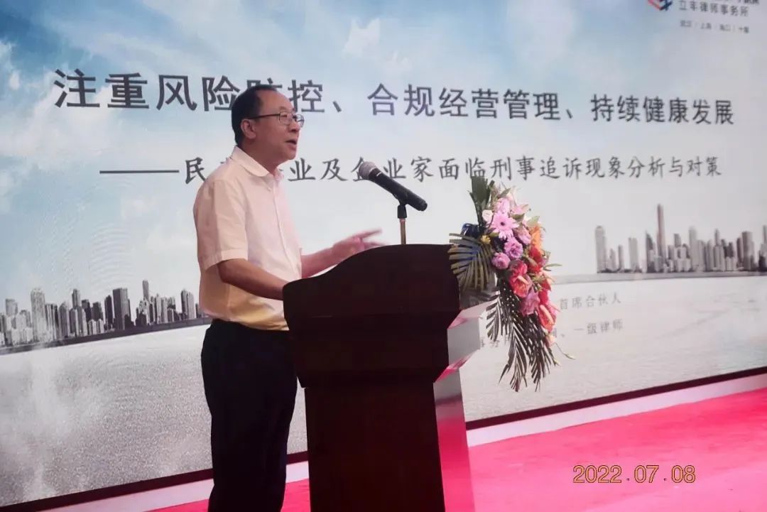 会议第二单元为海南楚商发展论坛,主题是“构建全过程维权服务体系”,依次由李取华、汪少鹏、毛园、贺静芳四位律师担任主旨演讲人。其中,汪少鹏律师的主旨演讲,以《注重风险防控、合规经营管理、持续健康发展——民营企业及企业家面临刑事法律风险分析与对策》为题,以实际的案例、详实的数据,结合司法实务现象,分析了我国民营企业及企业家所面临刑事司法风险的现状、原因,并提出有效防控风险的对策建议。