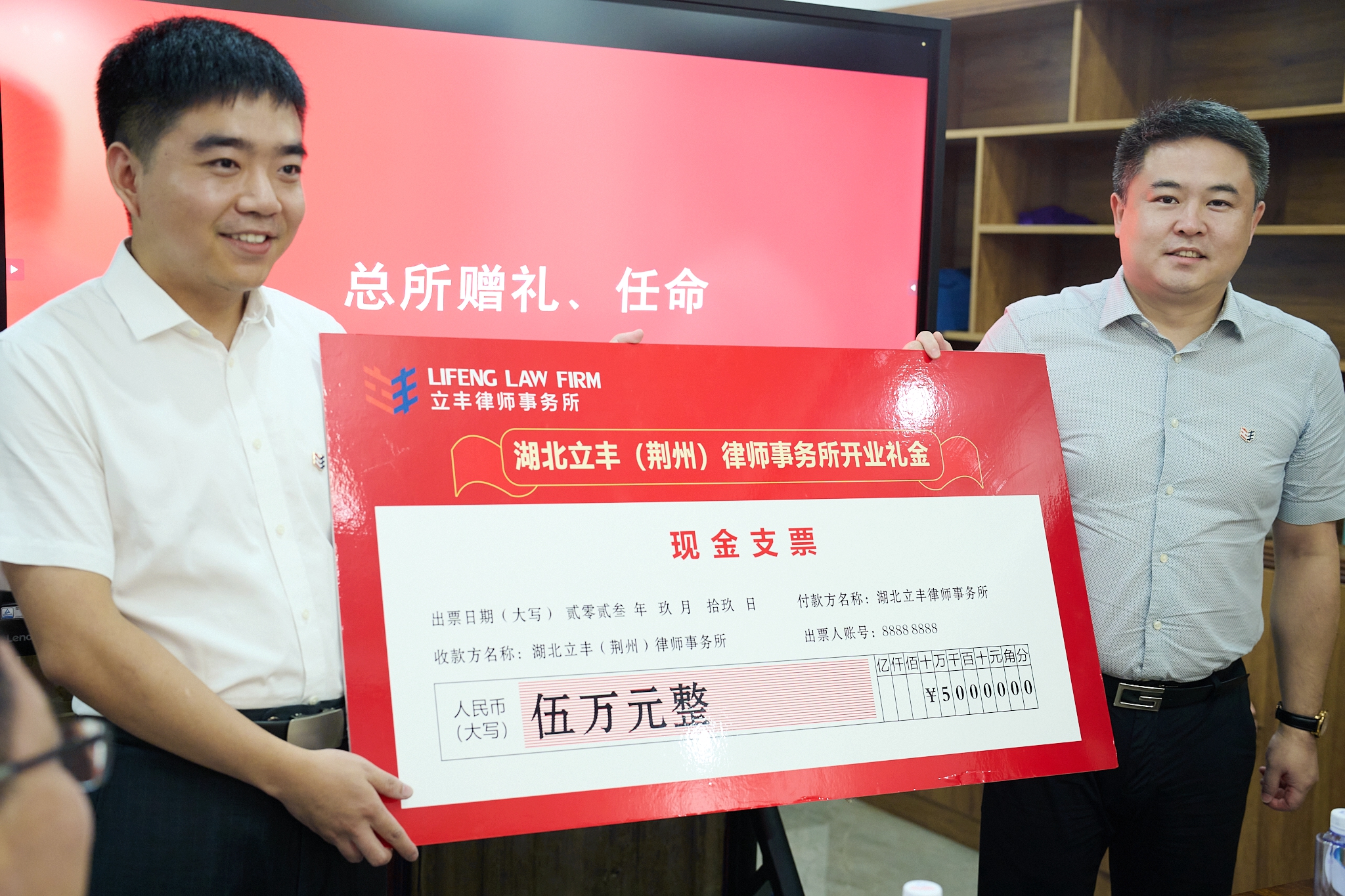 嘉宾致辞后,湖北立丰律师事务所主任刘勋对荆州分所主任何维笛、副主任李诚颁发任命书,并对立丰荆州分所赠予开业基金及礼品。