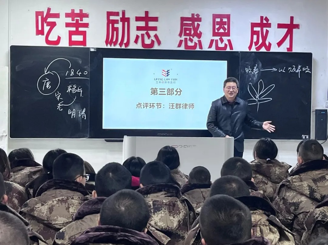 最后一个环节为沟通交流。汪群律师从自我介绍和了解同学们的日常生活与学习情况着手,拉近了彼此的心灵距离,并回顾了前面两位律师的讲课内容。他从校训“吃苦、励志、感恩、成才”出发,带领同学们重温“生于忧患,死于安乐”的典故。他还分享了周恩来总理在南开大学的名言,激励大家“莫等闲白了少年头,空悲切”,以及对父母、老师和社会充满感恩敬畏之心,将自己的个人价值与社会、国家的需求联系起来,树立正确的人生方向,为实现更高层次的人生价值而奋斗,并由此将本次授课与交流活动推向高潮,收获了老师与学生们的热烈掌声。