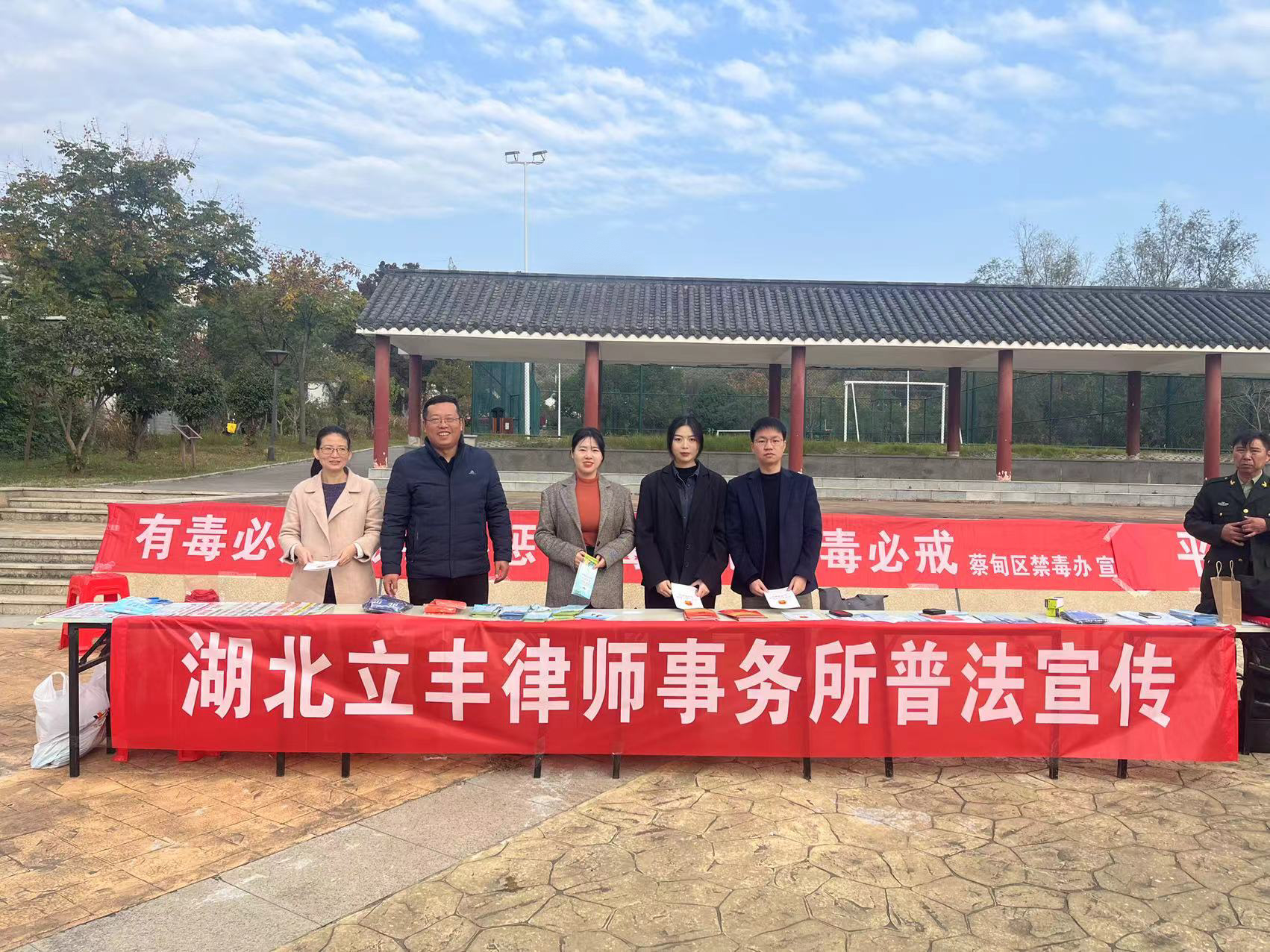 为贯彻落实习近平总书记关于加强法治宣传工作、严肃禁毒及反邪教方面的重要讲话精神。2023年11月24日,湖北立丰律师事务所(以下简称“立丰所”)联合蔡甸区索河街道平安办公室、蔡甸区索河街道司法所、蔡甸区索河街派出所、蔡甸区索河街道索河社区在蔡甸区索河街道文化广场开展“普法下乡、禁毒反邪教”主题普法宣传活动,助力乡村振兴。