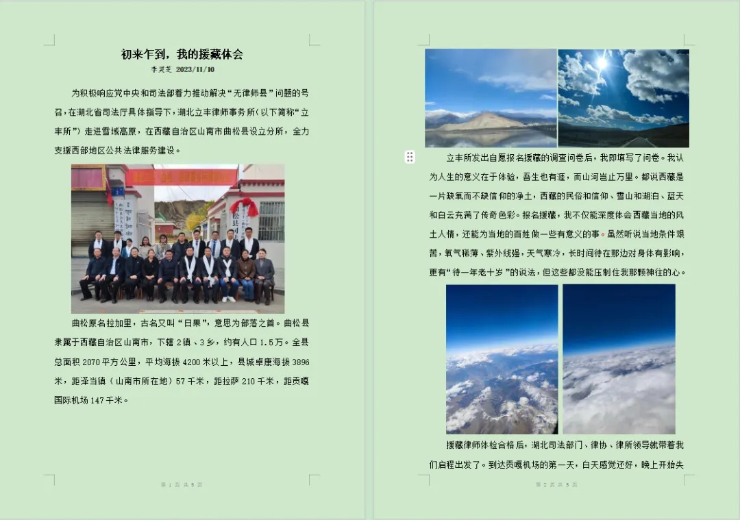 接着,王晓明同志给在座党员同志读了远赴西藏曲松“援藏律师”李灵芝同志发送来的《初来乍到,我的援藏体会》,并将1624字的体会发至支部微信群共同学习,向踏上雪域高原的援藏律师致敬,李灵芝同志相信自己定能不辱使命,担负起立丰的信任与支持,努力克服高原环境挑战,为西藏建设做一些“实实在在的事情”,交上一份满意的援藏答卷,用实际行动践行“人民律师为人民的”精神。