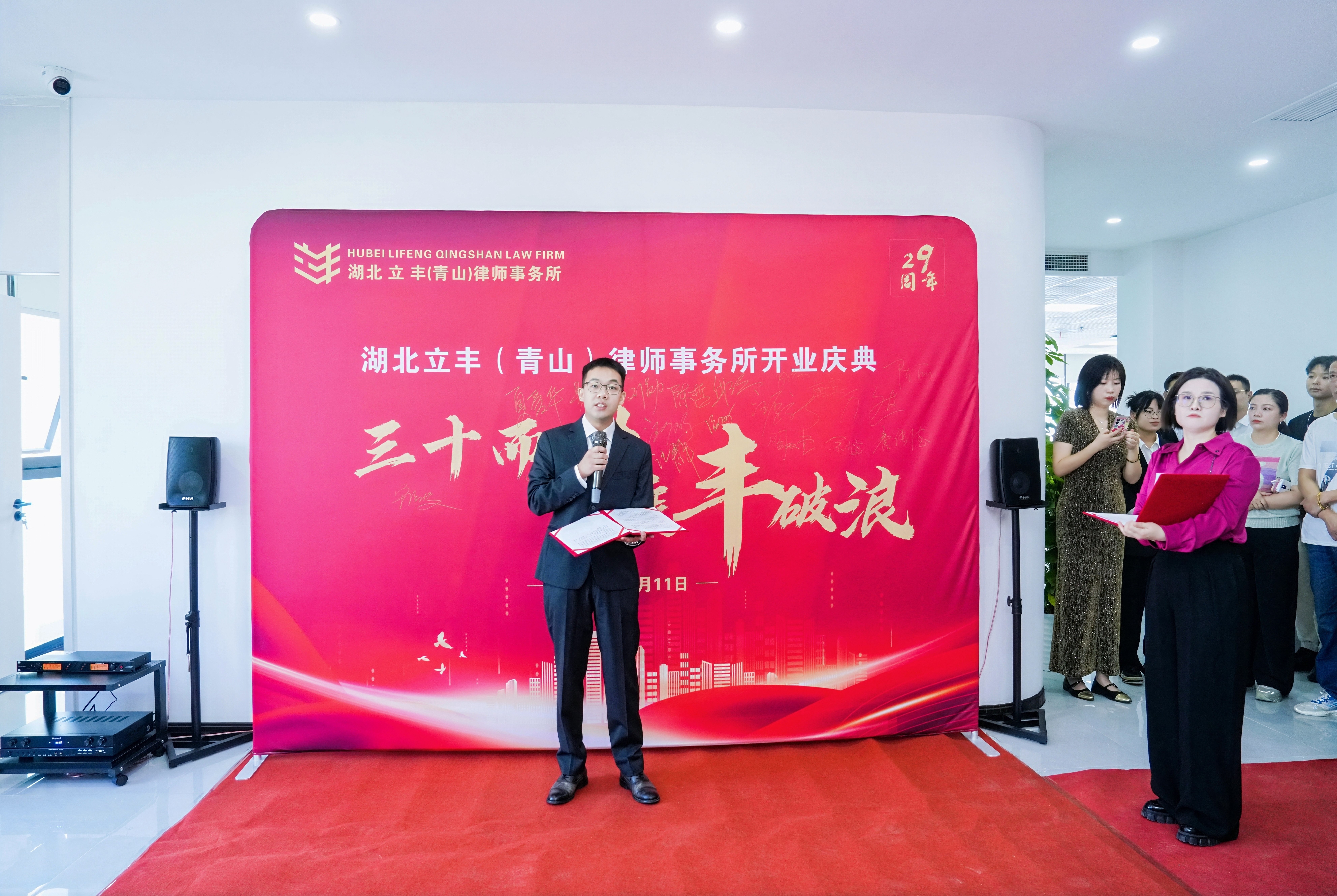 立丰青山分所主任张小吉向在分所筹备过程中给予支持和帮助的立丰所各位领导和全体高级合伙人、青山区各级领导及青山分所的同事们表达了诚挚的感谢。他表示对青山分所的未来充满期待与信心,一方面,在立丰所的各项支持下,立丰青山分所能迅速地在青山区扎根,深挖法律服务市场,不断吸收优秀法律人才,打造一支专业过硬、富有创新精神的律师队伍,为青山区的法治建设贡献一份力量;另一方面,立丰青山分所将与立丰其他城市、地区的分所保持密切的合作与交流,资源共享、优势互补,秉承立丰“厚德明法、博学笃行”之信条,共同推动立丰共同体的持续蓬勃发展。