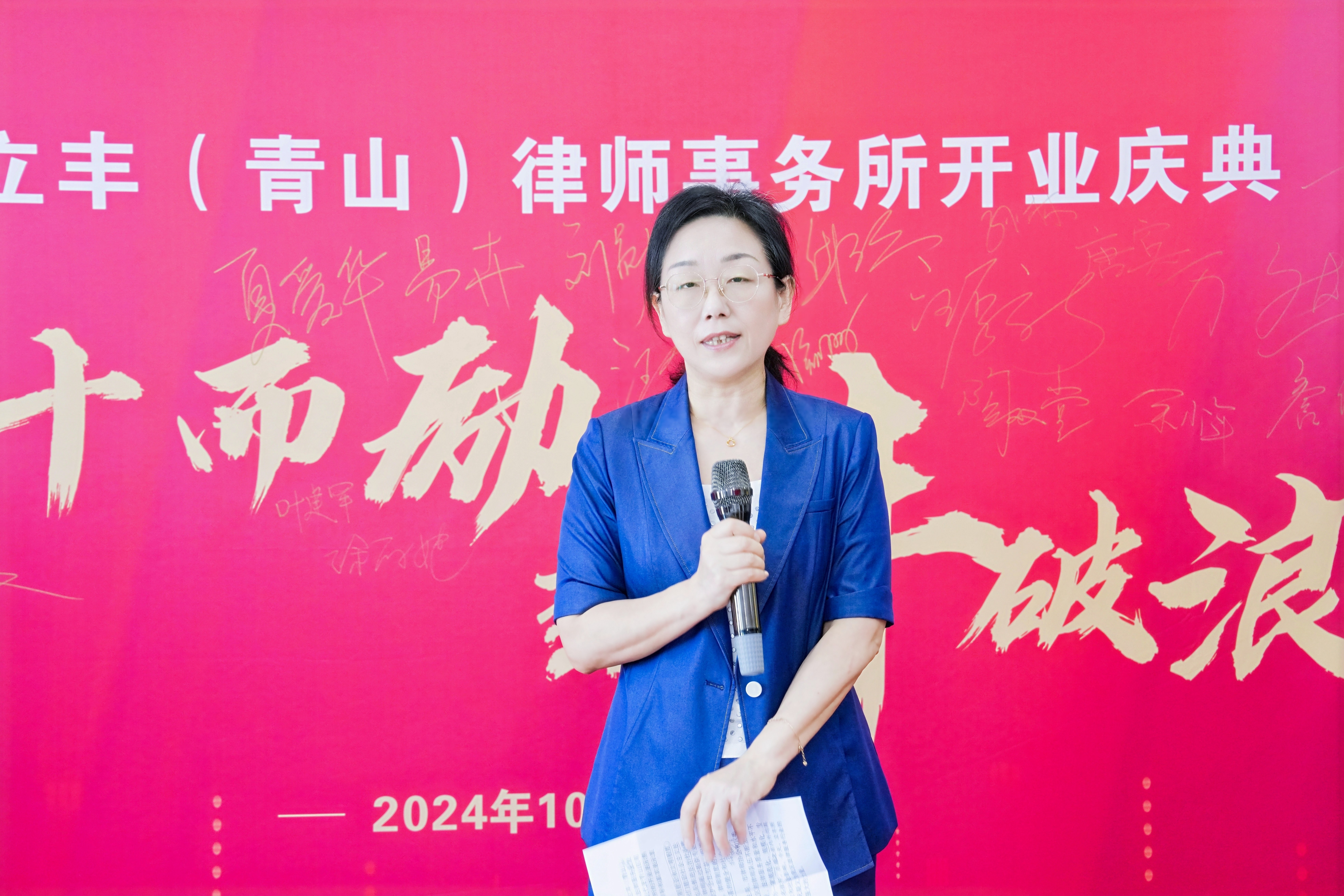 青山区司法局局长陈丽代表青山区司法局对立丰青山分所表示了祝贺,她指出律师制度是一个国家法制建设和文明程度的重要标志,律师是建设社会主义法治国家的重要力量,立丰所作为一家兼具规范化、规模化、专业化、品牌化的知名律所,现成功落户青山,无疑为青山区法律服务行业的发展注入了一支强大力量,她相信立丰青山分所一定能为青山区改革、发展和稳定带来积极影响。
